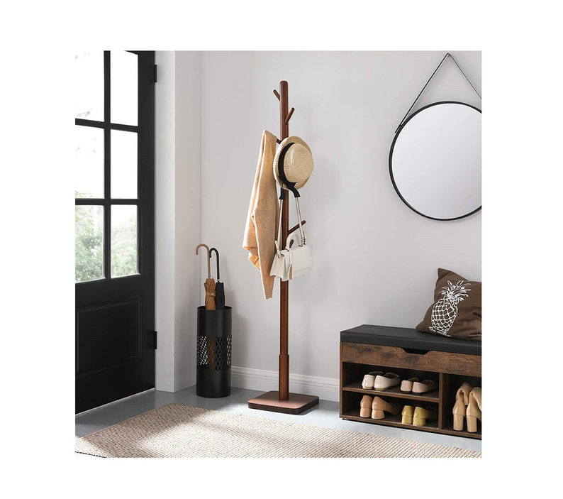 Image shows entryway with wooden coat hook, padded bench with shoe storage, and umbrella stand.