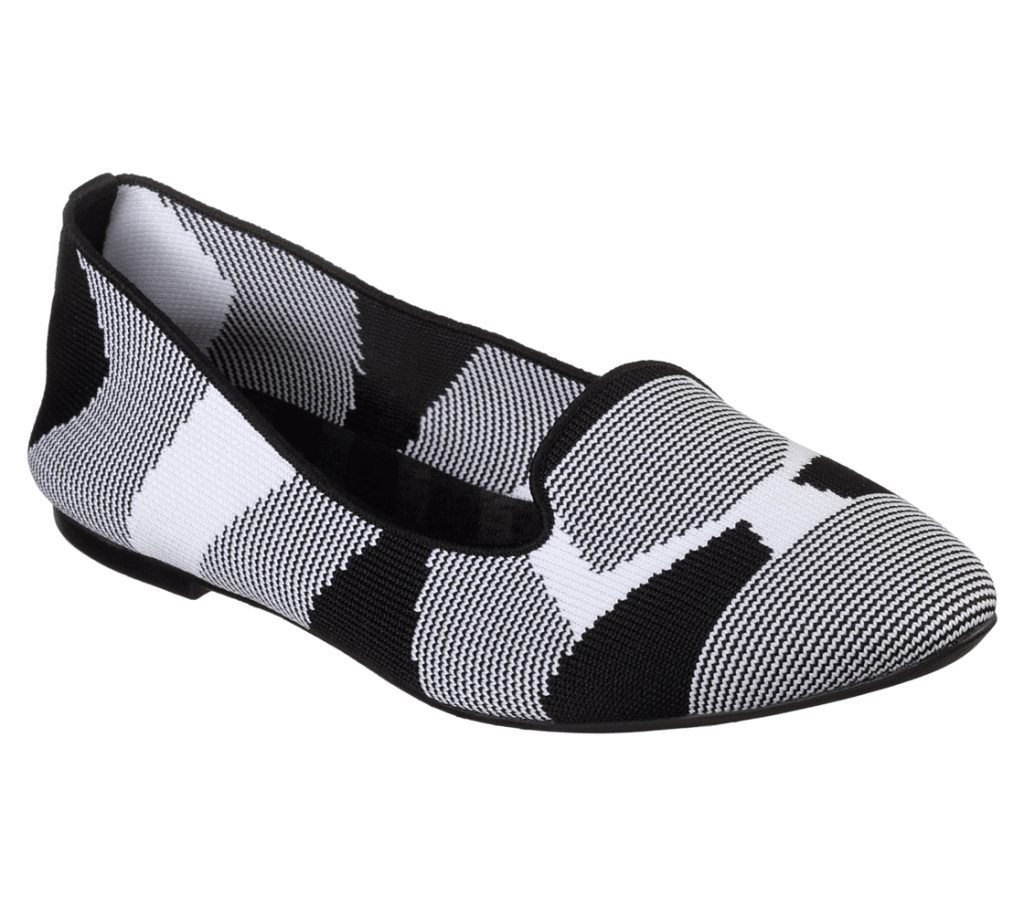Image of black and white geometric woven flat shoe, and links to Skechers website.